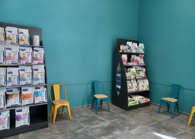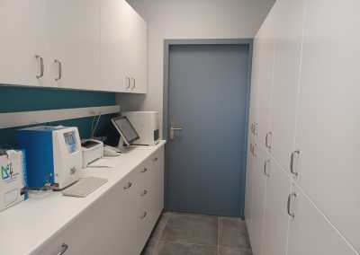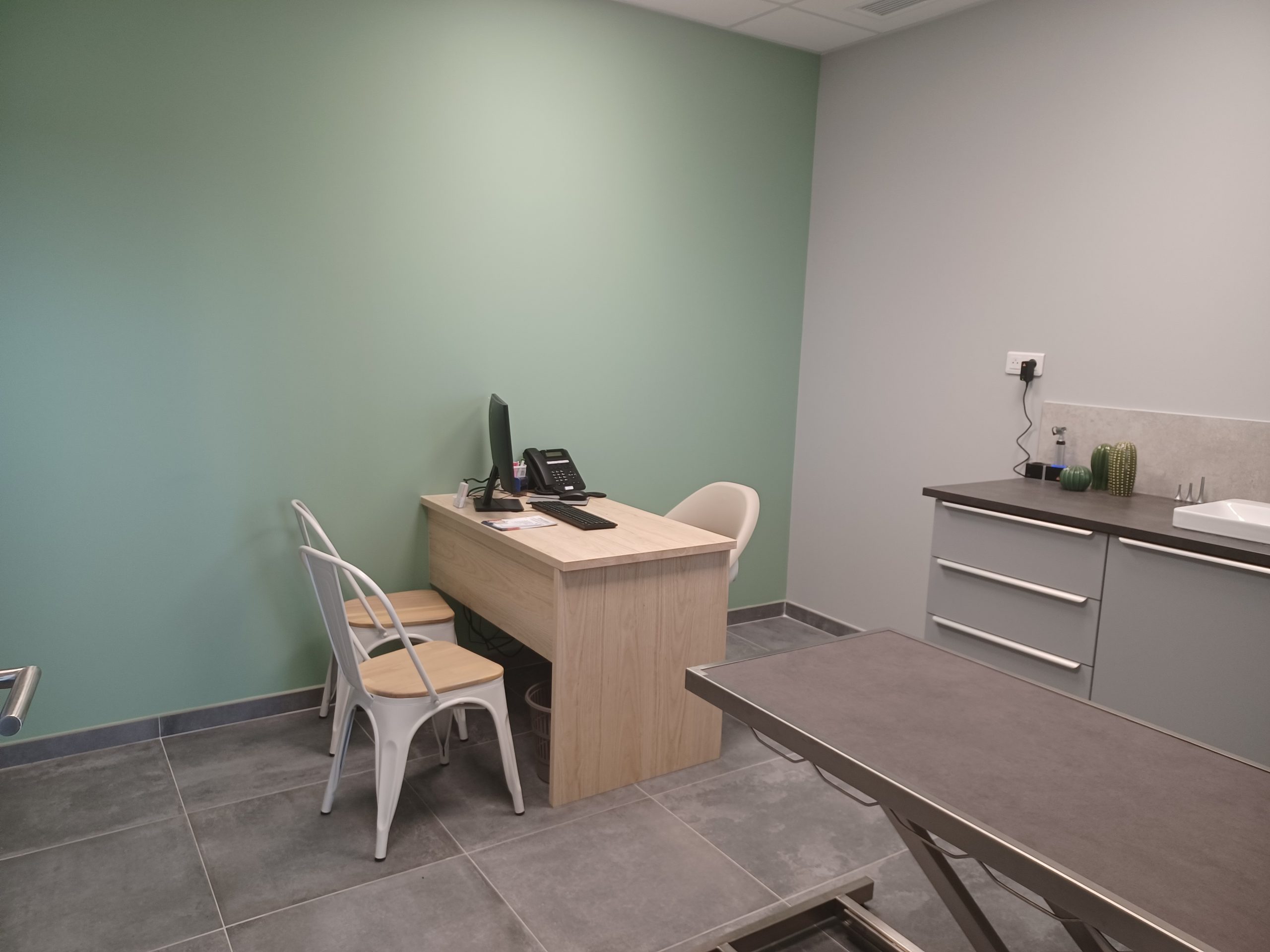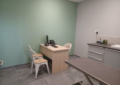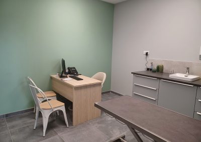 Une salle de consultation est également dédiée exclusivement aux félins et aménagée pour limiter le stress lors de la consultation (diffuseur de phéromone ).